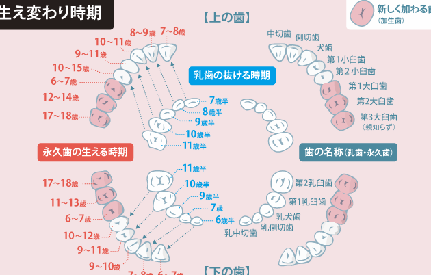 - 6歳頃: 最初の乳歯が抜ける時期。このとき、前歯から始まります。