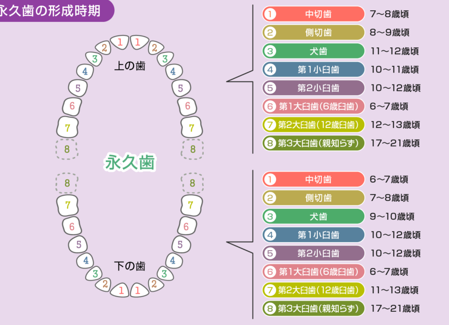- 9歳から12歳までに、全ての乳歯が永久歯に生え変わる。