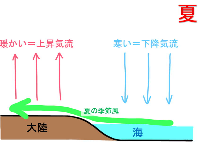 - 海と陸の温度差: 陸地は海水よりも早く温度が上昇し、冷却されるため、気圧差が生じる。