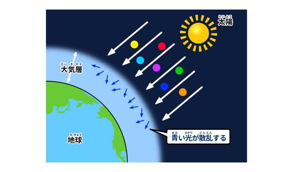 太陽光が大気に入ると、光は様々な方向に散乱する。特に青い光が多く散乱されるため、昼間の空は青く見える。