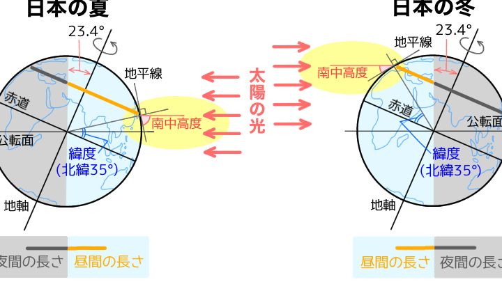 - その結果、太陽の高さが変わる。 夏の間は南中高度が高くなり、冬には低くなります。