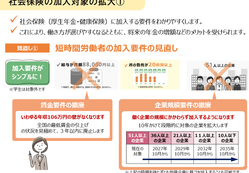 - 雇用保険の強化: 雇用保険の対象拡大により、失業時のサポートが向上します。