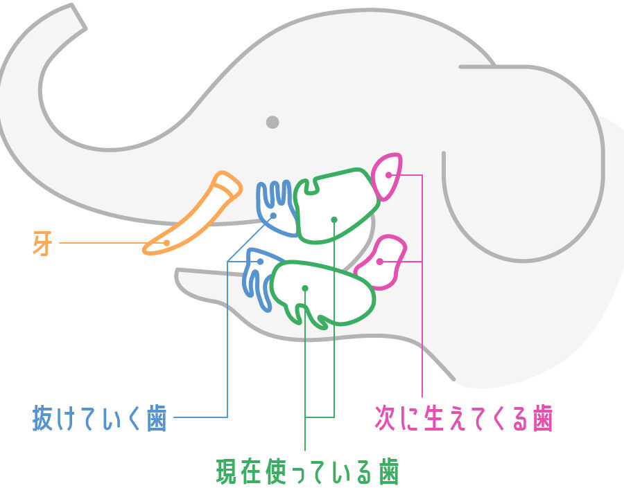 ゾウは数回にわたって歯が生え変わります。新しい臼歯が形成されることで、食事の質が保たれます。