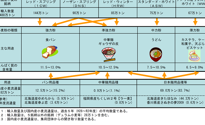 - 柔らか小麦:主にパンやケーキの製造に使用されます。グルテンが少なく、軽い食感が特徴です。