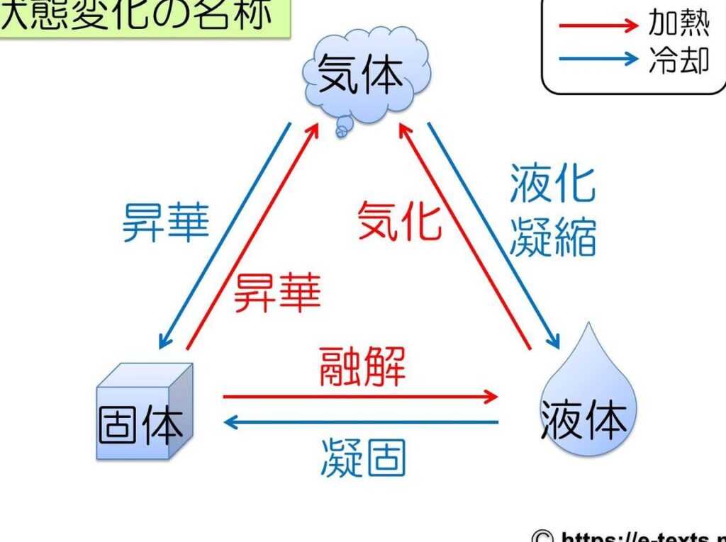 - 昇華: 固体が直接気体になる現象。ドライアイスが気体(二酸化炭素)になる時、液体状態を経由しません。