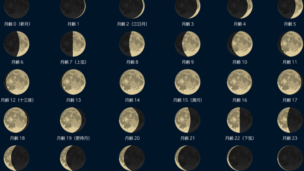 - 新月: 月が太陽との位置関係で見えない状態。