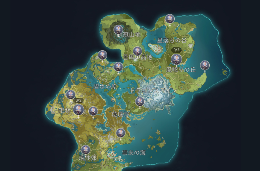 モンド地方の森林や山岳地帯、リーユエ地方の高所、スメール地方の砂漠地域などを回る。
