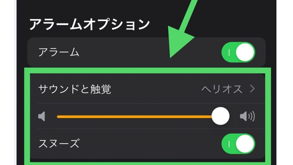 アラーム音量のスライダーを適切なレベルに設定。これで通常のアラーム音量を確保。
