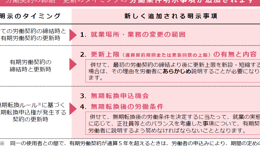 企業は従業員への労働条件を明確に示す必要がある。具体的には、次のような点が変わる: