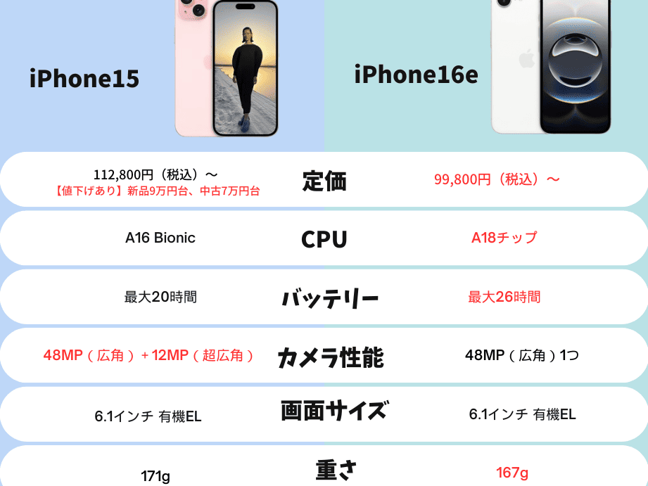 - iPhone15: シンプルなデザインで、基本的な機能を満たします。6.1インチのディスプレイ、デュアルカメラを搭載。