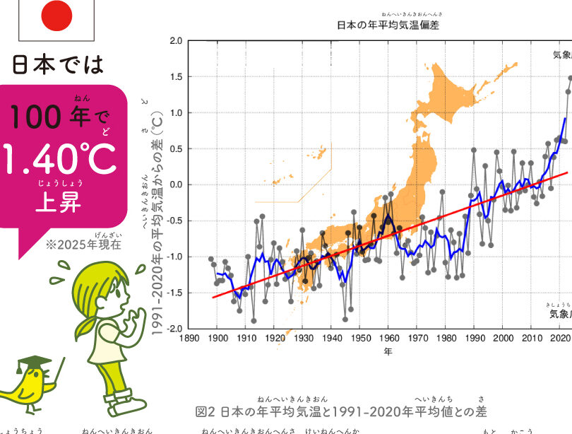 - 都市化が進み、ヒートアイランド現象が発生しています。これにより、都市部の気温が平均して高くなっています。