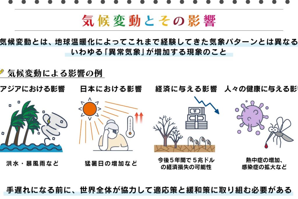 - 極端な気象現象: 台風や豪雨、干ばつなどが頻発し、自然災害のリスクが増大しています。