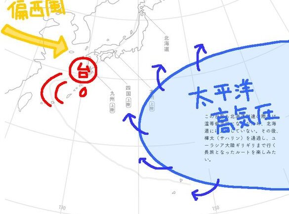 - 台風は季節風に乗って移動するため、その風向きが進路を決定する。
