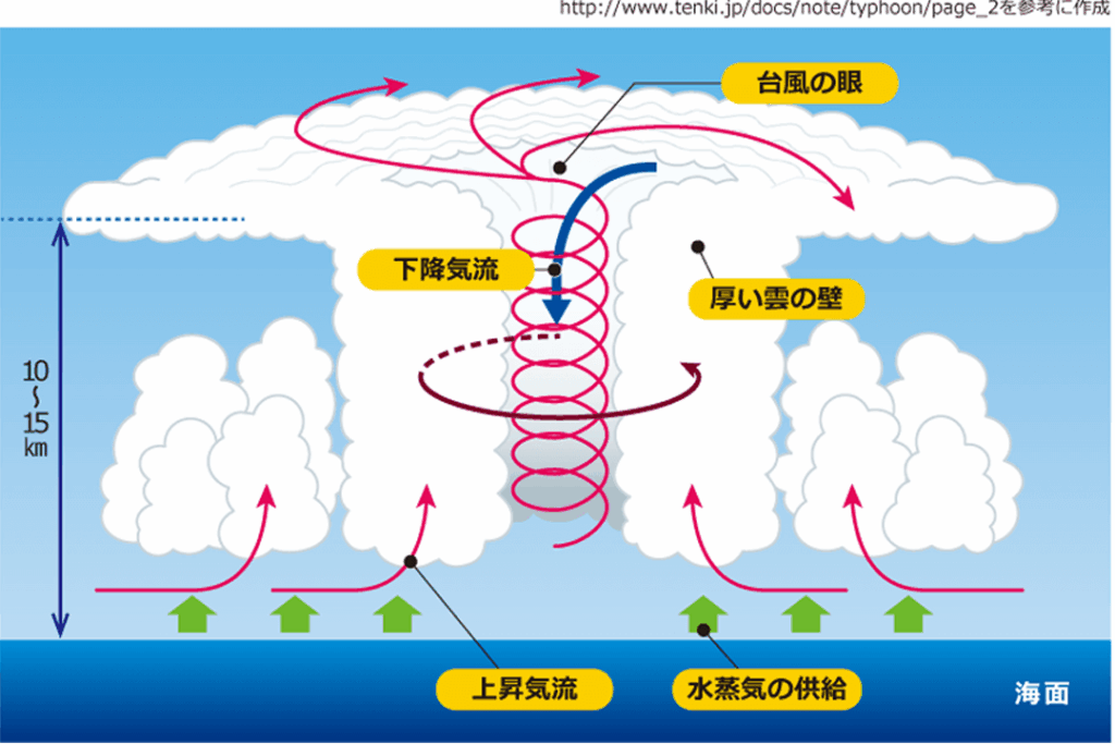 - コリオリの力: 地球の回転が台風の回転を助ける。