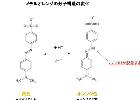 - メチルオレンジの役割を理解する。酸塩基の滴定やpH測定に使われます。