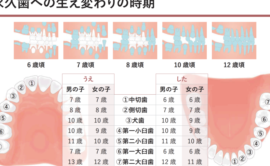 乳歯の生え変わりは、一般的に6歳から始まります。以下がその流れです。