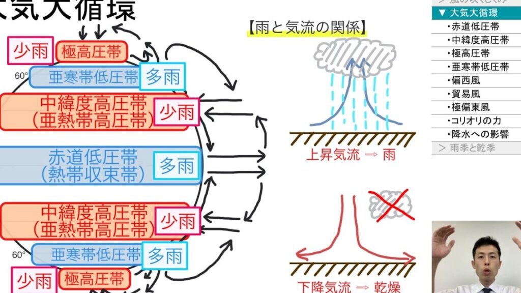 - 大気の流れ: 一般的に、偏西風が発生し高緯度地域から低緯度地域へ向かう。これが天気のシステムを押し進める。