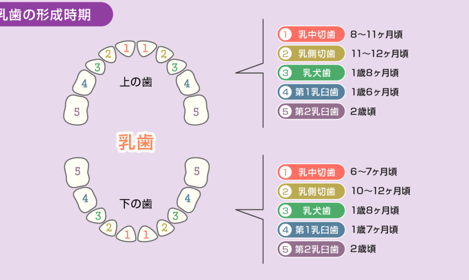 乳歯は通常、6か月から1歳半の間に生え始めます。小学入学時には、すべての乳歯が生えていることが期待されます。乳歯は以下のように段階的に生えます。