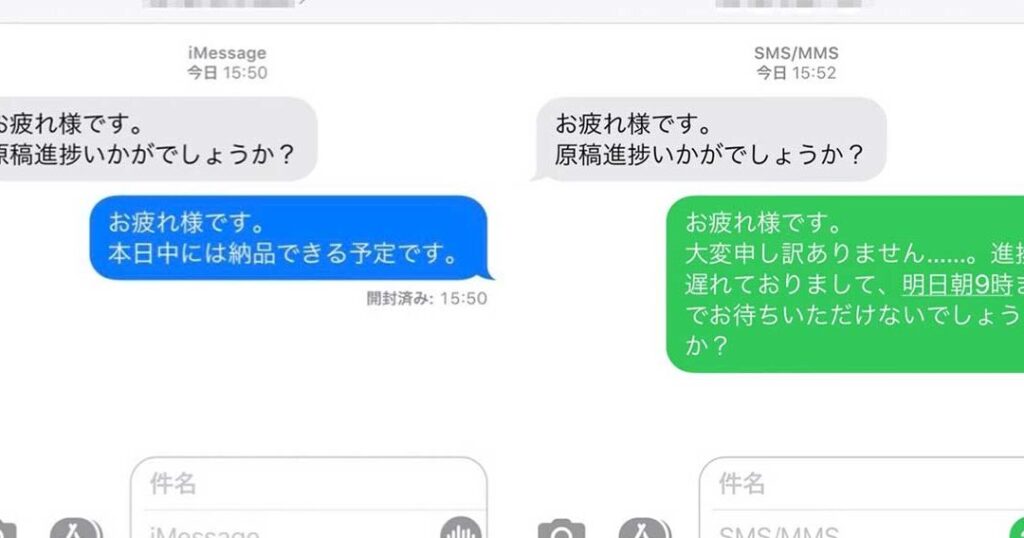 iMessageは暗号化されており、これが青色の特徴です。しかし、SMSは暗号化がなく、吹き出しが緑色になります。