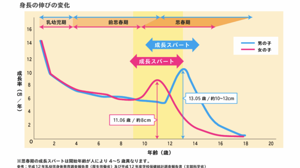 - 思春期: この時期は急成長期であり、ホルモンの影響で身長が大幅に伸びます。