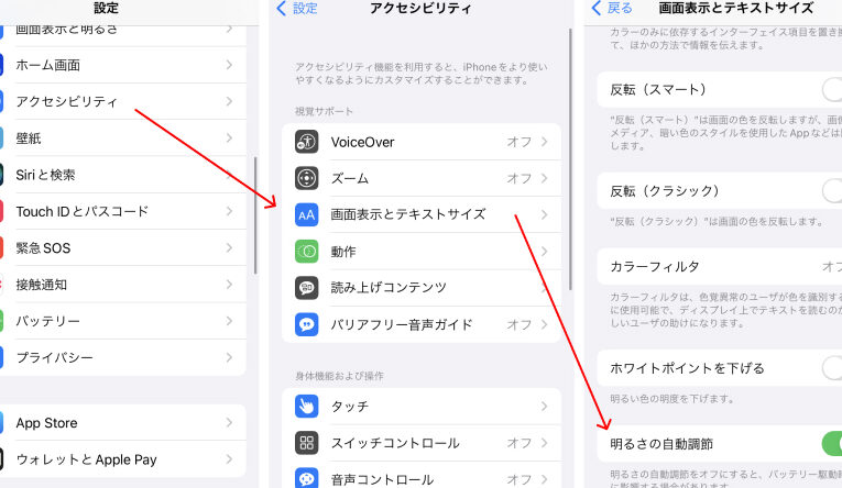 - 自動輝度調整機能:多くのスマートフォンには、自動的に周囲の光に応じて画面の明るさを調整する機能があります。この機能がオンになっていると、環境によって明るさが頻繁に変わります。