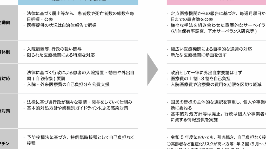 コロナウイルス感染症(COVID-19)が2類から5類に移行することによって、いくつかの重要な変更が生じる。これらの変化は、監視体制や医療対応に直接的な影響を与える。