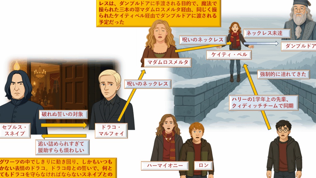 - スネイプとの複雑な関係が浮き彫りになり、彼の行動や選択がダンブルドアから影響を受けています。また、この関係は物語全体に緊張感をもたらします。