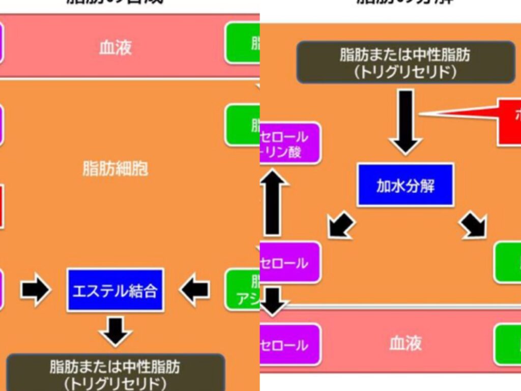 - トリグリセリドが分解される。体内の脂肪細胞から放出されたトリグリセリドが、ホルモン感受性リパーゼによって分解されます。